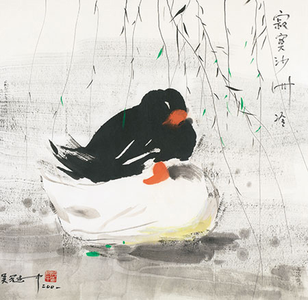 21世紀初,我參與(yu)(yu)編輯(ji)的(de)(de)(de)(de)(de)大(da)型(xing)美術畫(hua)集《二十世紀中(zhong)(zhong)國(guo)油畫(hua)》(6卷(juan)本)出版,吳(wu)(wu)先(xian)(xian)生(sheng)(sheng)為這(zhe)套鴻(hong)篇巨制撰寫了(le)精(jing)彩(cai)的(de)(de)(de)(de)(de)前言,并由(you)此(ci)萌發了(le)他(ta)(ta)想(xiang)要(yao)委托我編選(xuan)一(yi)(yi)套自己的(de)(de)(de)(de)(de)大(da)型(xing)個人專集的(de)(de)(de)(de)(de)設(she)想(xiang)。受(shou)此(ci)重(zhong)托,作為晚輩和職業(ye)編輯(ji),我既感(gan)到榮(rong)幸,又覺誠(cheng)惶誠(cheng)恐。但這(zhe)無(wu)疑是一(yi)(yi)個極有意義,極具價值的(de)(de)(de)(de)(de)出版項目。所以,雖歷經艱辛與(yu)(yu)周折,終于還是在(zai)2003年為吳(wu)(wu)先(xian)(xian)生(sheng)(sheng)完成了(le)《生(sheng)(sheng)命(ming)的(de)(de)(de)(de)(de)風景(jing)—吳(wu)(wu)冠中(zhong)(zhong)藝術專集》(4卷(juan)本)的(de)(de)(de)(de)(de)出版工作,使(shi)吳(wu)(wu)先(xian)(xian)生(sheng)(sheng)的(de)(de)(de)(de)(de)藝術成就得到了(le)國(guo)內外更廣泛的(de)(de)(de)(de)(de)關注。更客觀公正的(de)(de)(de)(de)(de)高(gao)度(du)(du)評(ping)價。畫(hua)集出版后(hou),吳(wu)(wu)先(xian)(xian)生(sheng)(sheng)把他(ta)(ta)的(de)(de)(de)(de)(de)這(zhe)幅《寂寞沙洲冷》送(song)給(gei)了(le)我。原來,這(zhe)是他(ta)(ta)以我的(de)(de)(de)(de)(de)那篇編后(hou)感(gan)言的(de)(de)(de)(de)(de)文章題目為題的(de)(de)(de)(de)(de)一(yi)(yi)幅精(jing)致的(de)(de)(de)(de)(de)水(shui)墨畫(hua),一(yi)(yi)黑一(yi)(yi)白(bai)的(de)(de)(de)(de)(de)兩只鵝在(zai)沙漠里相伴(ban)著(zhu)度(du)(du)過無(wu)窮歲月(yue),無(wu)言無(wu)語(yu)中(zhong)(zhong)表達的(de)(de)(de)(de)(de)是對“理解(jie)”的(de)(de)(de)(de)(de)渴望,對“共(gong)鳴”的(de)(de)(de)(de)(de)期待,對“春天”的(de)(de)(de)(de)(de)向往……—節錄自楊(yang)曄先(xian)(xian)生(sheng)(sheng)2010年12月(yue)1日新聞稿