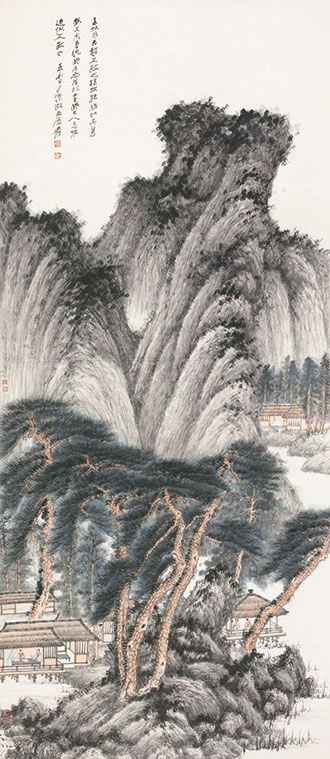 《溪山(shan)高隱圖(tu)》為王(wang)蒙(meng)名跡之一,現藏上(shang)海博(bo)物(wu)館(guan)。大(da)千在1937年即有(you)臨(lin)此本(ben)(ben),也是其(qi)筆(bi)下最(zui)早臨(lin)摹王(wang)蒙(meng)作品之一。畫(hua)上(shang)錄叔明(ming)論畫(hua)詩“老(lao)來(lai)漸覺筆(bi)頭(tou)迂,寫(xie)畫(hua)如同寫(xie)篆書(shu);黃(huang)鶴一峰山(shan)館(guan)靜,道(dao)(dao)人正是午參余。”丁(ding)亥十一月,筆(bi)下再(zai)有(you)臨(lin)本(ben)(ben),同錄上(shang)本(ben)(ben)題詩。再(zai)者(zhe),就是本(ben)(ben)幅構圖(tu)比較,“丁(ding)丑”本(ben)(ben)與本(ben)(ben)幅和原跡最(zui)為接近,布局位置相當精(jing)(jing)準,只是細節(jie)描寫(xie)更見繁(fan)密(mi)精(jing)(jing)細。本(ben)(ben)幅圖(tu)中(zhong)山(shan)石背(bei)后彎入處(chu)有(you)茅舍(she)三間,前后排列,正中(zhong)者(zhe)有(you)高士對坐,或似(si)捧書(shu)朗讀,又似(si)乎談經論道(dao)(dao);側房內有(you)內眷倚門窺(kui)探;臨(lin)崖處(chu),沿江筑(zhu)亭(ting),高士亭(ting)中(zhong)憑欄眺望,兩僮侍(shi)酒(jiu)在傍。人物(wu)在諸臨(lin)本(ben)(ben)中(zhong)最(zui)眾,且于(yu)前景(jing)巖上(shang)所(suo)植松樹,挺拔高聳,姿勢造(zao)型不一,橫(heng)枝(zhi)密(mi)披松針,結聚如蓋(gai),其(qi)尖(jian)細處(chu)見用筆(bi)銳而有(you)勁,極得(de)虬松體態(tai)的質感。茅舍(she)背(bei)后層(ceng)巒(luan)疊障(zhang),峰巒(luan)結聚似(si)交搭,中(zhong)間部分如深(shen)陷成谷,其(qi)解索(suo)皴的應(ying)用自如,在線條縱(zong)橫(heng)交不規則中(zhong),山(shan)巒(luan)肌理異(yi)現,而神韻具(ju)備,盡攝山(shan)樵之精(jing)(jing)髓(sui)矣!