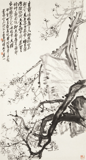 款識:古雪埋秋藤,日久化某樹。空山頗不無,見者果何處。夢踏昌蒲潭,拾級仰元墓。煙云沸虛實,蛟虬舞當路。腳底莓苔青,壹往壹卻步。野鶴驚人來,叫得寒天曙。甲寅四月維夏,試曼陀羅華手制墨作空山野花,吳昌碩時七十有一。