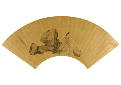 明(ming)末(mo)經濟繁榮,國力(li)鼎盛,始得珍貴的(de)金箋(jian)扇(shan)面,其(qi)品(pin)相(xiang)完美(mei),盡管(guan)經過數百年(nian)的(de)傳(chuan)承(cheng),扇(shan)面上(shang)依舊色(se)澤鮮明(ming)。金箋(jian)扇(shan)面雖然尺幅(fu)不大(da)(da),但由于(yu)形(xing)制特殊,兼之(zhi)(zhi)扇(shan)有(you)折痕,其(qi)落墨設(she)色(se)性(xing)能更難掌握,一般書畫家(jia)視(shi)若畏途,不敢(gan)隨(sui)意渲染。 本幅(fu)是(shi)陳(chen)(chen)洪(hong)綬(shou)(shou)早期(qi)人物(wu)畫風格。在(zai)構圖方面,簡潔明(ming)快,突(tu)出主(zhu)題。高仕(shi)倚石而坐,舉杯(bei)獨酌,可(ke)通過遙想、體味、構思而還原其(qi)思索而有(you)趣的(de)“虛擬(ni)現(xian)場”。 人物(wu)造型(xing)(xing)與歷(li)史上(shang)的(de)高士形(xing)象一脈相(xiang)承(cheng),而造型(xing)(xing)下豐(feng)上(shang)銳,是(shi)陳(chen)(chen)洪(hong)綬(shou)(shou)的(de)獨特造型(xing)(xing)語(yu)言;主(zhu)要(yao)運用高古(gu)游(you)絲描,線(xian)條有(you)力(li)而氣勢縱貫,為吳道子、李公麟人物(wu)畫的(de)優秀傳(chuan)統(tong);設(she)色(se)淡雅,加強了古(gu)意的(de)高雅氣質。論(lun)陳(chen)(chen)洪(hong)綬(shou)(shou)人物(wu)畫的(de)成(cheng)就,當在(zai)吳門仇十洲和(he)唐(tang)伯虎之(zhi)(zhi)上(shang)。 本幅(fu)經梁慧吾(wu)、仇焱之(zhi)(zhi)兩位名家(jia)舊藏,“天景(jing)樓”主(zhu)人梁慧吾(wu),為香港(gang)著名三大(da)(da)收(shou)藏家(jia)之(zhi)(zhi)一,與張大(da)(da)千交善。仇焱之(zhi)(zhi)更是(shi)古(gu)董收(shou)藏界的(de)一個重要(yao)記號。二(er)位名家(jia)復在(zai)品(pin)茗和(he)茶器上(shang)有(you)著獨特的(de)鑒藏品(pin)位,可(ke)與明(ming)末(mo)的(de)陳(chen)(chen)老蓮發起遙遠的(de)共鳴。
