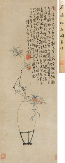 石濤筆下多是濃墨淡彩,雄渾的山水,研雅的花卉,寄托了對于女性的比喻。揚州擁有廣大的花卉貿易,在都市感官世界,花卉是極為重要的。石濤有關于“蘭花”的連篇醉語,也有又對百合花終日對臨,對花朵瞬間的美態偶有關心。尤其是僧伽年代,花卉作品更為罕有,在其最潛心佛事期間(1681年)僅一部出人意表的世俗畫冊,包含一段涉及西湘記的題跋,以及盛開的芙蓉和牡丹描繪。到1690年代中期,這種開放的感官主義在作品中變得普遍,并加入了豐富的色彩。如1695年為黃又所作《人物花卉冊》中的芙蓉,以渾圓的造型和勾線的花瓣暗示一個為歲月摧折的落拓美人。 本幅露出石濤筆下鮮有的嬌媚的紅色。以白居易《山石榴花》詩,大片題款布滿畫面,稱贊榴花之國色天香。石濤有《石榴營草》小堂幅,題詩云:“階前好種宜男草,室內常懸多子榴。此語殷勤無別意,愿君衰衰生公侯。”謂萱草、石榴,都是宜室宜家之物,非杜鵑等俗物可以比擬。 本幅收藏者郁葆青與其父郁懷智(1853-1918)出身英商洋行買辦,并經營棉布業致富。他是清末民初39個組織的參與者,其中包括上海地方自治運動、同業公會與慈善團體。以商馀學會副會長的身分,參與上海辛亥革命軍事行動前一晚的密謀集會。郁氏父子曾任滬軍都督府的財政部副部長及籌餉員,對都督府有所幫助。