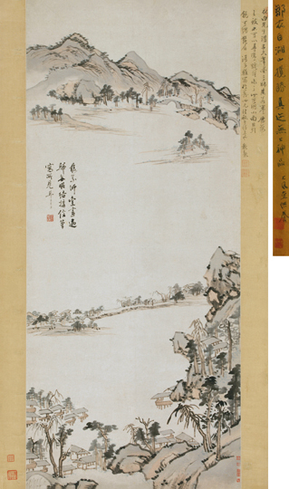 題跋:衣白先生得子久筆墨三昧,其若寒歷落之致,不可以尋常蹊徑求之。此幀湖山面目,引鏡可燭須眉。漚公雅富珍藏,此尤清秋仰益也。顥題。鈐印:朗倩、沈顥