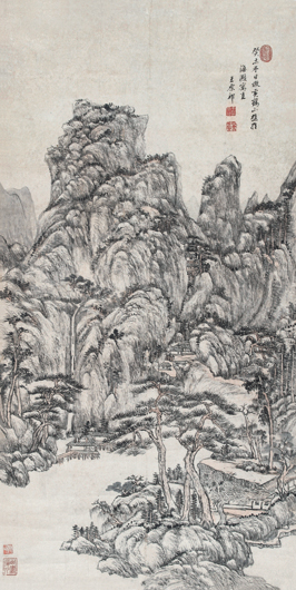 王原祁仿各家面目,畫風秀潤蒼渾,重視筆墨之美,所畫山水先筆后墨,由淡到濃,反復渲染,再以焦墨略作勾勒。王原祁在山水畫畫理方面有獨到的見解,提出繪畫用筆要有書卷氣,即下筆要有力度,有氣勢,有感情,輕重頓挫,元氣淋漓,力透紙背,入木三分,正所謂“筆端金剛杵”。在對畫家的修養要求上,王原祁最注重“人品”,認為“人品”高則“畫品”也高。還提出“龍脈為體,開合為用”的創作理論,發前人之所未發,堪稱為山水畫結構理論的重大發展。 張庚《國朝畫征綠》記他作畫,日復一日的漬、破點染,經半月始成。如今看他的畫,在一片混沌氣象中,石骨分明、陰陽凸現。或稱他為中國的立體派。觀此幅畫將山勢不斷分割,整個山體皆為碎石堆砌,并將山石抽象表現為“小塊”增加了畫面的張力和流動感。而堆砌小塊為大塊,山脈層層堆疊至天邊,并根據畫面的開合起伏、虛實等安排房屋、樹木。整幅畫面雖構圖繁復,但結構完整,房屋隱于崇山茂樹之間,瀑布清泉自峻嶺而下,山勢巍峨卻毫無壓迫之感,使得整幅畫面自然流出一種和諧之美。可謂“淡而厚,實而清”,是其晚年精品。根據屬落年款可知作于康熙四十二年(1703),作者時年六十二歲。同作于海淀寓直的作品有現藏于北京故宮博物院,創作于1707年(66歲)的《丹臺春曉圖》。