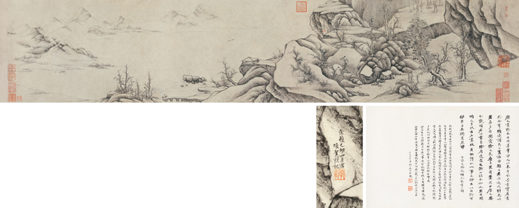 項圣謨初字逸,改字孔彰,號易庵,又號胥山樵、存存居士、醉風人、大酉山人、蓮塘居士、鴛湖釣叟等,項圣謨的祖父為著名收藏家項元汴,家族豐富的收藏為他摹古學習提供了便利的條件。但項圣謨生逢亂世,他經歷了國破家亡,只有出走逃避現實,因此他更多的作是以遠游寫生作品居多,他將師法傳統中學到的筆墨技法與自然山水相結合,同時通過畫中題詩抒發自己心中的情感,憤懣而激憤,帶有托物言志的色彩。 項圣謨的學習對象廣泛,他曾經自述“余髫年便喜弄柔翰,先君 子責以舉子業,日無暇刻,夜必篝燈,著意摹寫,昆蟲草木,翎毛花竹,無物不備,必至肖形而止。”可見他的用功。董其昌曾經題跋項圣謨《前招隱圖》:“出入荊關,規模董巨,細密而不傷骨,奔放而不傷韻”,并說他樹石、屋宇與宋人血戰,董其昌并非夸大,項家確實收藏過荊關董巨的作品,項圣謨吸收了他們作品中的冷峻氣息,多有發揮。但因時代相隔較遠,具體說來,項圣謨更多是承襲了文徵明、董其昌的畫風,尤其是借鑒吸收了文氏畫樹的技法。 《江山雪霽圖》作于崇禎己卯,即1639年,項圣謨并沒有說自己是畫的何地何景,但據畫面看,應是一幅臨古作品,張伯英在跋中就稱此有王維《江山雪霽》筆意,但不同于受董其昌影響下的松江畫派,此卷造型寫實,用筆周密,構圖嚴謹,畫面中充溢著濃郁的隱逸情調和強烈的主觀情感,給人以秀逸、空靈、冷峭的韻味,正如陶澍所評“其畫法刻意古人,絕去俗塵”。 《江山雪霽圖》中的主要景物都安排在右半部分,因是雪景,山石的皴擦也少,但看起來很有立體感,樹枝基本落光,但還是倔強的立在原地,以期來春的重生。遠山只以淡墨染出輪廓,而能有咫尺千里的意味。尤其要說明的是此畫原為吳三桂女婿王永寧舊藏,王永寧還是拙政園的主人,收藏過王羲之《瞻近帖》、顏真卿《鹿脯帖》、楊凝式《神仙起居法》、米友仁《瀟湘圖》等名跡,收藏眼光非常之高,項圣謨《江山雪霽》卷尾也鈐有王永寧的收藏印,可見其寶愛之心。