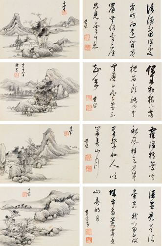 藝壇盟主 彪炳百代 有明一代彪炳畫史的人物當中,當無任何人能勝過光耀奪目的董其昌。其不僅以堅忍卓絕的勤奮與天賦異稟的才華成為了當時最重要的書畫家,更以能鑒善辨的品評能力飲譽天下。他成為趙孟俯之后唯一能在書畫創作、收藏、品評、理論演繹等諸多方面馳騁藝壇之人。他所倡導的“南北宗論”,直接影響了他身后兩百多年間的中國畫壇的繪畫風貌,并成為近三百余年來,文人畫創作的主導思想。 董其昌不僅是當時藝壇的領軍人物,在漫長歷史中他的理論及思想不斷成為后世研究的對象。作為有明一代的大文人,董其昌除了書畫作品,還留下了大量的文字資料。《董其昌全集》收錄董其昌撰述、編著等著作計13種,250萬字,是研究董其昌詩文、書畫、生平、交游以及董氏所涉及文史、諸子、禪學等等最為翔實的基礎性資料,也是研究晚明政治、社會生活諸方面的一部綜合性專著。 因而董其昌像一個通往藝術神殿的密碼,一直深受帝王貴族、歷代藏家的追逐。難怪有學者將董其昌的展覽命名為“董其昌的世紀The Century Of Tung Ch'i-Ch'ang 1555-1636”。 董其昌雖處于趙孟、文征明書法盛行的時代,但他的書法卻直接上朔至“二王”。他在《畫禪室隨筆》中自述其學書經過:“初師顏平原《多寶塔》,又改學虞永興,以為唐書不如晉魏,遂仿《黃庭經》及鐘元常《宣示表》、《力命表》、《還示帖》、《舍丙帖》,凡三年,自謂逼古,…彼游嘉興,得盡睹項子京家藏真跡,又見右軍《官奴帖》于金陵,方悟從前妄自標評。”由此可見,遍臨各家法帖并能在項元汴處盡睹真跡是其書法得以精進的重要原因。其書風飄逸空靈,風華自足,筆畫圓勁秀逸,平淡古樸。在當時已“名聞外國,尺素短札,流布人間,爭購寶之。”(《明史?文苑傳》)。 尤其是在他去世后的一百年多年,康熙皇帝對他書法的推崇輩至,更使得其更加聲名遠播,人盡皆知。連皇帝本人的書法風格都是和董其昌如出一轍的。筆畫圓勁秀逸,平淡雍容,字間與行間疏朗勻稱。乾隆皇帝對董其昌也是極其贊賞,不僅常臨摹董其昌的書法,且將眾多名跡收歸石渠寶笈。 董其昌的繪畫,十分注重師法古人技法傳統。他處處講究摹古,卻不泥古不化,在筆和墨的運用上,有獨特的造詣,形成自我風格。他山水畫墨色干濕濃淡,,清雋雅逸,以平淡天真取勝。同為能畫善鑒的民國收藏家吳湖帆對這位華亭前輩的作品也推崇備至,盡心搜羅,在他的《梅影書屋書畫記》記載了部分他的收藏精品,董其昌是其中單個書畫家中收錄最多的,約為十四件。 書畫合璧 獨步天下 書畫合璧這種冊頁的形式最早出現在明代中期,其為觀賞書法與繪畫雙善的藝術家提供更好的展示方式。吳門四家中文征明有少量這一形式的作品傳世,而真正將這種形式發揮到極致則是董其昌,他也是這種形式最積極的支持者和推廣者。 從現有紀年的作品來看,董其昌書畫合璧冊頁的創作多出現在晚年,根據他自己的論述來看,晚年其對自己的藝術水準相當自負,如50歲(1604)是題其自書詩卷尾云:“今日臨古古詩數首,俱不入晉人耳,唯顏平原、虞永興、楊少師三家,差不愧也。”興許是因為這樣的自信使得他更愿意通過一套冊頁來展示其在書法、繪畫和詩詞上的過人之處。 筆精墨妙 難得一見 此件《書畫合璧冊》共八開,均繪制于一種特別的箋紙之上,署款“玄宰”“董玄宰戲”,鈐印“董其昌印”、“董氏玄宰”、“宗伯學士”。每開做平林小景對題唐詩,詩意皆和畫意,書畫合璧相得益彰。其款識與北京故宮博物院《書畫合璧山水十開冊》極為相似,從印色看為典型明代朱砂印泥。 整篇書法瀟灑飛揚一氣呵成,字里行間疏朗有致,其結字用筆之水準可見其力追“二王”之功力。現藏北京故宮博物院的董其昌《臨淳化閣帖》堪稱其晚年精品力作,時年七十八歲的董其昌從壬申(1632年)歷時月余,選臨十卷,第六、七、八、九卷為董其昌臨王羲之、王獻之諸帖,與此冊書法在字形運筆有諸多相較之處。 如《臨淳化閣帖》第六卷中“清”字, 《臨淳化閣帖》第七卷中“虛”字,“處”字。 國內博物館的董其昌書法合璧的冊頁共計十六本 《臨淳化閣帖》第八卷中“深”字,“山”字,“君”字,“君”字點劃的轉折提筆的向下呼應,體現著董其昌對細節生動處理。 《臨淳化閣帖》第十卷中“當”字,“見”字。 以及款識第七卷、八卷“其昌”二字。 從兩件書法單個相同字體的對比中,更見書法家一以貫之的用筆習慣。只是由于臨帖的原因《臨淳化閣帖》字形較緊湊,而《書畫合璧冊》由于興致所至,一氣呵成顯得更為舒朗,這與董其昌的名篇佳作草書白居易的《琵琶行》一樣,筆勢縱橫,神氣縹緲。 “發”、“無” 董其昌最好的繪畫也出自此時,在此階段正是董其昌對技巧及表現力充滿自信的時期,觀者可以從畫面中感受到一股穩定的秩序感,這與其早中年如《葑涇訪古》那樣常見的夸張變形的扭曲山形所呈現的緊迫感完全不同,這也許是此時的他已經可以隨時拿出黃公望的《富春山居圖》心追手摹(1596年此卷已為董氏所藏)的緣故,他的構圖顯得更加樸實無華卻詩意盎然。此四開繪畫皆采用簡化的倪瓚一江兩岸式構圖,近景與遠景的相互關系由近景中的雜樹體現,其樹法則多選用其擅長的點染,樹枝聚散錯落,點葉多變,墨色煥然。藏于不同景致中的茅屋與樓閣則體現出