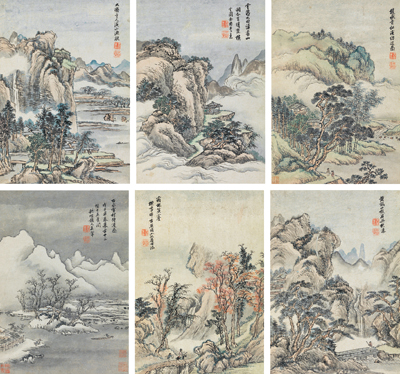 《摹古山水冊》作于康熙四十七年(1708),王翚時年七十七歲。共六幀,其中《趙承旨松溪訪道圖》繪崇山峻嶺之間,青松藹藹,云氣氤氳,二高士在路口相遇,與松溪訪道圖主旨相合。《云藏太白讀書山》王翚自己講是用的關仝《晴麓橫云》筆意,《晴麓橫云》始自關仝,之后宋徽宗、馬遠皆畫過這一題材,王翚鑒古無數,以其摹古功力將傳統化入自家面貌中,尤為生動。《大癡老人溪山漁艇》以黃公望筆下常見之披麻皴為主,但用色更加大膽,遠景與近景形成一種蒼茫的感覺。《黃鶴山樵石梁秋瀑》用王蒙筆法,皴點密而勁,山石厚重,水流急湍,但樹枝還是王翚自家面目,觀者一望即知。《霜林策蹇》合李唐、唐寅于一體,二人均是北宗代表畫家,可見王翚合南北宗之畫學理想。《右丞雪村待渡圖》曰用王維畫法,滿眼雪山,一片蕭瑟之景,極盡縱目之感。 此冊為金望喬、陸心源遞藏,二人都是藏書家,金望喬好商周彝器與金石書畫,收藏過大名鼎鼎的張萱《搗練圖》,陸心源家有皕宋樓,收藏名聞天下。《摹古山水冊》著錄于《穰梨館書畫錄》卷三十九,知原為十二幀,今缺其半,惜哉!此次上拍六幀為《趙承旨松溪訪道圖》、《云藏太白讀書山》、《大癡老人溪山漁艇》、《黃鶴山樵石梁秋瀑》、《霜林策蹇》、《右丞雪村待渡圖》,缺《燕文貴江山勝□圖》、《水田蒲柳》、《湖村消夏》、《米襄陽云山蕭寺》、《梅花庵主墨精神》、《秀絕倪迂筆》。 所幸在分離之前,陸心源友人俞啟元曾借觀通臨一遍,使我們可以借此欣賞。俞啟元,字夢丹,號端庵,浙江紹興人。清光緒中任刑部郎中,以知府分省補用,任江蘇候補道。俞啟元臨本落款稱“穰梨館藏本,己巳秋向陸叔同太守借觀,山陰俞啟元臨于武昌。”“己巳”應為同治八年(1869),那么陸心源收藏此冊至少在這一年之前,而從陸家流出去,應該是陸心源去世以后的事情了。