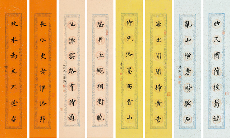 本幅(fu)“花箋四景聯(lian)(lian)(lian)”匯四色(se)(se)灑(sa)金花箋而(er)成,集“長松秋水”“瑤井(jing)仙(xian)源”“亂山曲幾”“居士侍兒”粹合一套(tao)。全(quan)聯(lian)(lian)(lian)對仗工整而(er)意境清(qing)麗(li),引經劇(ju)典而(er)不造作,團花、箋色(se)(se)俱呈,書法(fa)雍(yong)容端正,聯(lian)(lian)(lian)語春風(feng)(feng)化典。與和(he)晚年方正平(ping)和(he)的風(feng)(feng)格迥然不同。其(qi)富貴、其(qi)清(qing)雅,天上人間(jian),四地風(feng)(feng)華,實(shi)可(ke)為溥心畬書法(fa)之雅妙逸品。