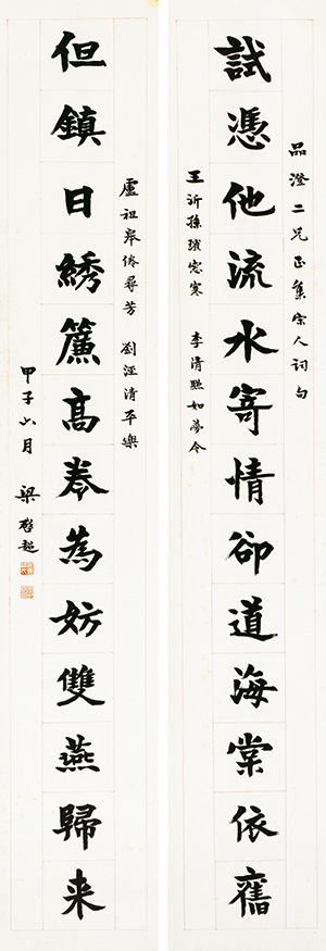 梁啟超自己曾說(shuo):“我做這頑意(yi)兒,免不了孔(kong)夫子罵的‘好行小慧’。但是‘人生愁恨誰能(neng)免’,我在傷(shang)心時節尋(xun)些消遣,我想(xiang)無論(lun)何人也該和我表點同情(qing)。”此聯詞(ci)藻既美(mei),書法亦佳(jia),有金石味(wei)而兼(jian)書卷氣,是梁任公學養之完(wan)美(mei)詮釋也。