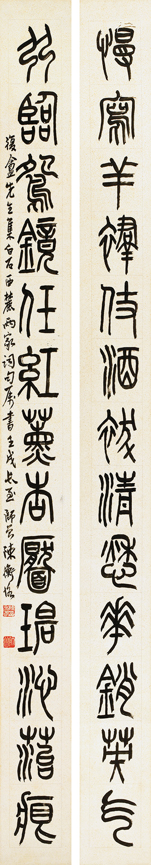 陳(chen)師曾(ceng)生(sheng)前常自稱(cheng)其(qi)(qi)(qi)藝“生(sheng)平(ping)所(suo)能(neng),畫(hua)為(wei)上(shang) ,書印次之,詩詞又次之” 。故而后人(ren)論其(qi)(qi)(qi)藝事便多(duo)以其(qi)(qi)(qi)書畫(hua)篆刻稱(cheng)譽“槐堂(tang)三(san)絕(jue)” 。此(ci)聯是陳(chen)師曾(ceng)為(wei)羅(luo)(luo)復堪(kan)(kan)所(suo)制,巍巍十三(san)字(zi)猶(you)如(ru)(ru)高山屹立,端莊厚(hou)(hou)重之中充溢(yi)著(zhu)一種鏗鏘作響的(de)金石氣息(xi)。羅(luo)(luo)復堪(kan)(kan)與(yu)(yu)陳(chen)衡恪的(de)交往(wang),最早源于(yu)羅(luo)(luo)氏之兄(xiong)羅(luo)(luo)癭公。羅(luo)(luo)癭公是民(min)國(guo)時期著(zhu)名戲曲(qu)家(jia),曾(ceng)與(yu)(yu)陳(chen)師曾(ceng)、齊白石、梅蘭芳、程硯秋等(deng)藝術家(jia)交游甚廣,羅(luo)(luo)復堪(kan)(kan)亦喜好書法(fa)金石,民(min)國(guo)初期鑄有袁(yuan)世凱(kai)頭像的(de)銀幣(bi)"壹圓(yuan)"二(er)字(zi)即出其(qi)(qi)(qi)手筆。然(ran)羅(luo)(luo)復堪(kan)(kan)眼(yan)界頗(po)為(wei)高,對(dui)于(yu)書壇名家(jia)頗(po)多(duo)評品(pin),其(qi)(qi)(qi)在北(bei)平(ping)諸子之中唯(wei)對(dui)陳(chen)師曾(ceng)學識敬愛有佳。陳(chen)氏所(suo)以贈此(ci)聯筆力雄強,結構精準。款字(zi)行書運筆圓(yuan)渾,如(ru)(ru)“錐(zhui)畫(hua)沙”、“屋(wu)漏痕”,顯得特別(bie)淳(chun)厚(hou)(hou)沉郁(yu),完全體現(xian)了(le)他蒼拙古健、恬淡(dan)脫(tuo)俗(su)的(de)書風(feng)。