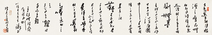 從(cong)(cong)技(ji)法(fa)(fa)(fa)上(shang)(shang)看(kan),此(ci)幅作(zuo)品當是(shi)(shi)潘(pan)(pan)(pan)天(tian)(tian)(tian)壽(shou)(shou)在藝(yi)術(shu)上(shang)(shang)趨于成熟的(de)(de)(de)(de)時(shi)期時(shi)所書。 從(cong)(cong)用(yong)筆(bi)(bi)上(shang)(shang)看(kan),這幅作(zuo)品與(yu)潘(pan)(pan)(pan)天(tian)(tian)(tian)壽(shou)(shou)的(de)(de)(de)(de)以(yi)(yi)圓筆(bi)(bi)為主的(de)(de)(de)(de)篆、隸(li)書不同,而(er)是(shi)(shi)多(duo)(duo)為側鋒方切和側帶中(zhong)、中(zhong)帶側的(de)(de)(de)(de)用(yong)筆(bi)(bi),從(cong)(cong)而(er)增加(jia)了用(yong)筆(bi)(bi)的(de)(de)(de)(de)靈活和字(zi)勢的(de)(de)(de)(de)飛(fei)動(dong)。而(er)且,除(chu)了少(shao)數筆(bi)(bi)畫(hua)被夸張拉長,或輔以(yi)(yi)牽絲連帶外(wai),點畫(hua)皆短促斬截,隨著起(qi)筆(bi)(bi)轉鋒動(dong)作(zuo)順勢而(er)過,或收鋒或出鋒,或折鋒轉入下筆(bi)(bi),而(er)極少(shao)藏(zang)頭逆鋒和圓轉形(xing)(xing)態。這種瘦勁、生辣、峻峭并略帶荒率的(de)(de)(de)(de)線條形(xing)(xing)質,可(ke)(ke)(ke)以(yi)(yi)說(shuo)是(shi)(shi)潘(pan)(pan)(pan)天(tian)(tian)(tian)壽(shou)(shou)書法(fa)(fa)(fa)藝(yi)術(shu)的(de)(de)(de)(de)一個主要特(te)征。在結(jie)體(ti)上(shang)(shang),潘(pan)(pan)(pan)天(tian)(tian)(tian)壽(shou)(shou)的(de)(de)(de)(de)此(ci)幅作(zuo)品更值得稱(cheng)道,可(ke)(ke)(ke)貴之(zhi)處在于“勢險(xian)而(er)歸于平夷(yi)(yi)”,而(er)且是(shi)(shi)錯落(luo)有致、渾(hun)然(ran)天(tian)(tian)(tian)成,時(shi)而(er)結(jie)體(ti)寬博,時(shi)而(er)結(jie)體(ti)緊密,從(cong)(cong)字(zi)形(xing)(xing)上(shang)(shang)來看(kan),大(da)多(duo)(duo)取縱長之(zhi)勢,而(er)在大(da)小上(shang)(shang)隨時(shi)調整(zheng),可(ke)(ke)(ke)謂大(da)小錯落(luo)、斜正穿(chuan)插、疏(shu)密映襯。從(cong)(cong)布(bu)局(ju)和章法(fa)(fa)(fa)上(shang)(shang)看(kan),這幅作(zuo)品也(ye)是(shi)(shi)可(ke)(ke)(ke)圈(quan)可(ke)(ke)(ke)點,那就是(shi)(shi)在有限的(de)(de)(de)(de)行列(lie)之(zhi)間,藝(yi)術(shu)家充分調度著字(zi)與(yu)字(zi)之(zhi)間的(de)(de)(de)(de)聚散、避讓、生克,乃(nai)至由字(zi)與(yu)行、點線與(yu)空白的(de)(de)(de)(de)互動(dong)關系所構成的(de)(de)(de)(de)收放對比(bi)、動(dong)靜對比(bi)、虛(xu)實對比(bi),無不貫穿(chuan)著造險(xian)、破險(xian)、以(yi)(yi)險(xian)制夷(yi)(yi)、反欹為正的(de)(de)(de)(de)創作(zuo)思路,以(yi)(yi)服務于章法(fa)(fa)(fa)上(shang)(shang)的(de)(de)(de)(de)開合(he)起(qi)落(luo)效果,而(er)且打破行行相列(lie)、正文與(yu)署款(kuan)主從(cong)(cong)分明的(de)(de)(de)(de)傳(chuan)統(tong)習慣(guan)。這些,都(dou)標(biao)志著潘(pan)(pan)(pan)天(tian)(tian)(tian)壽(shou)(shou)對傳(chuan)統(tong)成規(gui)的(de)(de)(de)(de)反叛(pan)與(yu)突(tu)破,也(ye)體(ti)現著潘(pan)(pan)(pan)天(tian)(tian)(tian)壽(shou)(shou)對書法(fa)(fa)(fa)藝(yi)術(shu)的(de)(de)(de)(de)美學思考。正如沙孟海所說(shuo)的(de)(de)(de)(de)那樣(yang):“從(cong)(cong)結(jie)體(ti)、行款(kuan)到整(zheng)幅布(bu)局(ju),慘淡(dan)經營,成竹(zhu)在胸;揮灑縱橫,氣(qi)勢磅礴(bo),富有節(jie)奏感,可(ke)(ke)(ke)說(shuo)獨(du)步(bu)一時(shi)。”
