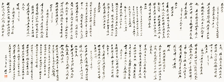此幅作品每字各自護持,各有營陣,但整體上卻是一般氣象;筆畫雖不復雜,但因藏頭護尾、綿中含勁,多字集排則猶如武侯的八陣全圖,顯得意境緲遠、變化萬端,使觀者從字紙間頓悟出“人從橋上過,橋流水不流”的禪機。還有他晚年書寫的一副華嚴經偈:“于諸惑業及魔境,世間道中得解脫。猶如蓮華不著水,亦如日月不住空。”字體古雅平和,蕭散自然。尤其值得注意的是,充溢于字紙間的是對人間塵事的體悟,將菩薩行行止于人間,正是“世間道中得解脫”的精神使得這副字盡見人文的觀照。