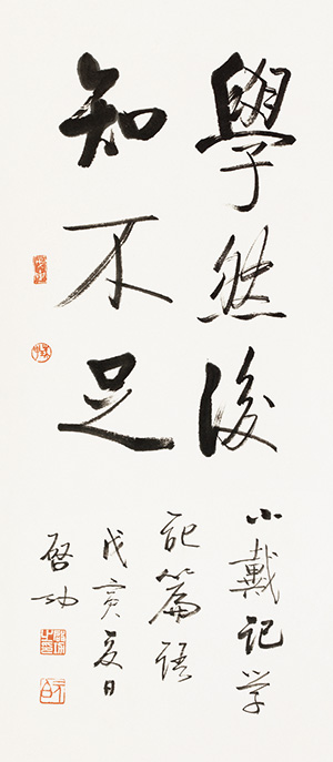 啟功書(shu)(shu)“學(xue)(xue)然后(hou)知不(bu)足(zu)”為《小戴禮記》中的句子,透(tou)出了啟功先(xian)(xian)生(sheng)(sheng)謙遜好(hao)學(xue)(xue)的儒者之風。啟功先(xian)(xian)生(sheng)(sheng)有(you)一首(shou)論黃(huang)庭堅(jian)書(shu)(shu)法的絕句說:“字中有(you)筆意(yi)堪傳,夜雨鳴廊(lang)到(dao)(dao)曉懸。要(yao)識涪(fu)翁無秘密,舞筵長袖(xiu)柳(liu)(liu)公權。”其實啟功先(xian)(xian)生(sheng)(sheng)自己(ji)的字,其淵源也是(shi)柳(liu)(liu)公權。柳(liu)(liu)體嚴謹精到(dao)(dao),法備氣至(zhi),正與啟功先(xian)(xian)生(sheng)(sheng)的學(xue)(xue)人性情相一致(zhi),所以啟先(xian)(xian)生(sheng)(sheng)的字取(qu)法于柳(liu)(liu)公權尤(you)多。前人論書(shu)(shu)說“顏筋柳(liu)(liu)骨(gu)”,是(shi)講柳(liu)(liu)公權的字有(you)骨(gu)力、硬(ying)朗(lang),而啟先(xian)(xian)生(sheng)(sheng)的字同樣注重骨(gu)力,線條硬(ying)朗(lang)干(gan)練,毫無拖泥帶水之態。