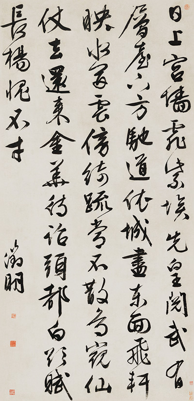 此幅文徵明行書《游西苑詩》筆意老到,結體精研,氣勢雄強,通觀整幅作品,凡運指、凝思、吮毫、濡墨,與字之起落、轉換、大小、向背、長短、疏密、高矮、疾徐,莫不有法。他在書法上的用工之深,由此可見一斑。