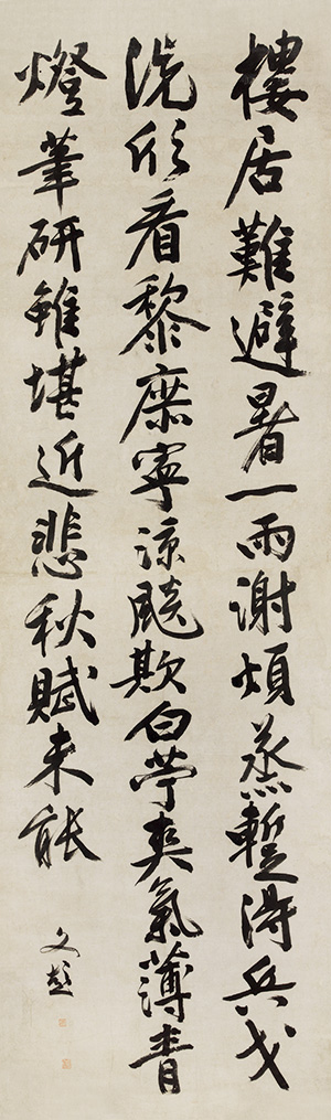 細察此件書法可知,文彭脫胎其父,出入晉、唐 (“二王”、孫過庭等),兼融宋、元(黃庭堅、趙孟頫),又取法時彥(祝允明等),出古人新,熔冶百家,卻渾然無間,自成風格。其用筆以中鋒為主,不避偏毫,參用隸法,多取橫勢,與立軸形制對比強烈又不相違犯;結字或大或。小,偶見牽連,卻氣脈暢達,映帶自如,仿佛無形之線串起散珠,又如婀娜美人綴滿佩飾。此作于章法上跌宕起伏,欹側生姿,動感十足,字密而行疏,筆致輕盈飛動,提按明快,于行筆中呈現出抑揚頓挫的節奏,毫無滯澀突兀之感。通篇以運筆的迅疾與紆緩、點畫的盈縮與縱放、結字的穩妥與活潑等來表現內在節奏和韻律的變化。其點畫的線質堅實蒼勁,似“老樹枯藤”,使作品在疏密、收放、用筆的枯潤等多方面形成了鮮明的對比,凸顯出豐富的層次性與強烈的視覺沖擊力,讓人體會到書家情感的跌宕起伏,使觀賞者在靜態畫面的反復摩挲中產生動態體驗,不僅開辟了廣袤無垠的審美空間,而且形成了深邃幽遠的審美時間(過程)。學者錢穆說過,憑借較少的物質表現出創造者豐富的個性的藝術,只有音樂和書法。通過欣賞此作,便可印證書法藝術不僅展現造型之長,更兼具音樂之美。