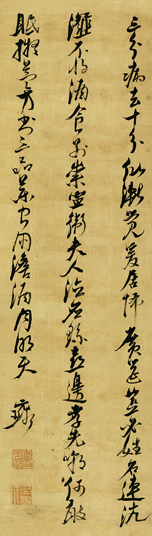 倪元璐最擅行草書,此幅《草書七言詩》筆調輕快,意氣風發,展現了倪氏書法成熟后的一般風貌,整幅作品章法平正,拉寬的行距使得視覺感上更顯疏朗,下筆果敢,點畫奇崛,以露鋒入紙,常見起筆處為尖頭,如第一行“十”字,翻折多于使轉,有硬朗無畏之態,結構偏長,有很強的個人風格特征,在用墨上,此幅枯筆并不多,卻十分生動自然,在處理字與字之間的關系上,我們并沒看到此處倪元璐費心安排的跌宕,而是以一種平中見奇的方式,貌似收斂其實放縱的心態,來展現其獨特的個人風貌,鋒棱四露中見蒼渾,并伴有少量枯筆與濃墨相映成趣,結字欹側多變,大膽吸取顏真卿楷書中宮疏放的特點,同時將方正的結體變長,強化偏旁,使得字形產生強烈反差,尖削的結體給人一種精神振奮之感,曾有人戲稱其書為“刺菱翻筋斗”,其棱峭生動之姿被刻畫得淋漓盡致,形容在此幅作品上再恰當不過。 康有為在《廣藝舟雙楫》中說:“明人無不能行書者,倪鴻寶新理異態尤多。”其草書風格的形成,除了善于從王右軍、顏魯公和蘇東坡等古人的經典中得到滋養,更在于他的“新理異態”,不斷地摸索創新的可能性,使其能最終自出新意于史。倪元璐在植根于傳統的同時,又在竭力地尋求變化,走出自己的風格,其學古人,靈活變通,其學蘇東坡,便能將蘇字的扁平結字特征,反其道地化為偏長狹瘦的自家構字法則;學王羲之,卻能把王氏書中居多的方筆,變成自己腕下能隨機生發的圓筆;晚年追摹顏真卿,取其“屋漏痕”意,書風漸趨沉渾,又能將揉、擦、飛白、渴筆等技法引入其中,借以豐富作品內涵。倪元璐之子倪后瞻說:“倪鴻寶書,一筆不肯學古人,只欲自出新意,鋒棱四露,仄逼復疊,見者驚叫奇絕。方之歷代書家,真天開叢蠶一線矣。”