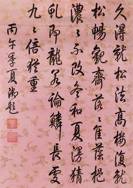 此(ci)作書于乾(qian)(qian)隆五十(shi)二(er)年(1786),此(ci)時的乾(qian)(qian)隆帝,已是七十(shi)六(liu)歲高齡(ling),但(dan)此(ci)作筆力絲毫(hao)不(bu)(bu)(bu)懈,書寫流(liu)暢(chang)婉(wan)轉,未見任(ren)何衰(shuai)老之(zhi)氣。乾(qian)(qian)隆曾撰寫《八征耄念之(zhi)寶(bao)記》曰:“予年七十(shi)時,用杜甫句鐫‘古稀(xi)天子之(zhi)寶(bao)’,而即繼(ji)之(zhi)曰‘猶(you)(you)日(ri)孜(zi)孜(zi)’不(bu)(bu)(bu)敢(gan)怠(dai)于政也。”表示自(zi)己依然朝乾(qian)(qian)夕惕,為政不(bu)(bu)(bu)敢(gan)有絲毫(hao)懈怠(dai)之(zhi)心。此(ci)作即鈐有“古稀(xi)天子之(zhi)寶(bao)”、“猶(you)(you)日(ri)孜(zi)孜(zi)”二(er)印,可見乾(qian)(qian)隆晚年自(zi)強不(bu)(bu)(bu)息的精神(shen)狀態(tai)。
