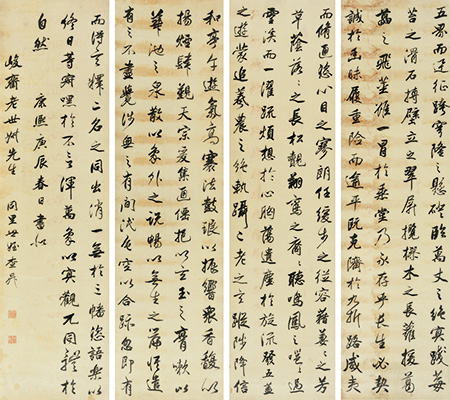 此四屏書法為(wei)査昇代(dai)表之作(zuo),行筆俊逸瀟灑,如春云(yun)舒卷(juan),秋水澄清,使人(ren)觀而忘俗(su)。