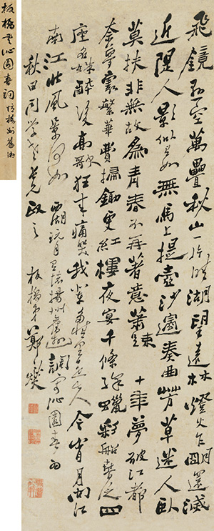 鄭板(ban)橋書(shu)法(fa)藝術的(de)(de)(de)(de)形成,是一個從有法(fa)到(dao)無法(fa),從臨摹到(dao)創新(xin)的(de)(de)(de)(de)過程(cheng)。他(ta)自稱“六分(fen)半(ban)書(shu)”,就說(shuo)明(ming)了(le)他(ta)的(de)(de)(de)(de)取(qu)法(fa)來源,自然(ran)也(ye)避(bi)免不了(le)對(dui)古(gu)人(ren)的(de)(de)(de)(de)追摹。探源甚古(gu),用力極(ji)勤。他(ta)“字學漢魏,崔、蔡、鐘,古(gu)碑斷碣,刻(ke)意搜(sou)求”,并對(dui)《蘭亭序》、《自敘帖》、《瘞鶴銘》,以(yi)及蘇東坡、黃山谷等人(ren)的(de)(de)(de)(de)墨跡,反復臨習。阮(ruan)元(yuan)《廣陵詩事(shi)》曰:“板(ban)橋楷法(fa)極(ji)為(wei)工(gong)整,自謂世人(ren)好奇(qi)(qi),因(yin)正書(shu)中雜以(yi)篆隸,又間參(can)以(yi)畫法(fa),故波碟之(zhi)中,往往雜以(yi)石紋(wen)、蘭葉。”此論說(shuo)明(ming)板(ban)橋于(yu)書(shu)法(fa)入隸于(yu)楷、或參(can)畫法(fa)的(de)(de)(de)(de)創新(xin)之(zhi)處,全然(ran)以(yi)其雄厚的(de)(de)(de)(de)楷書(shu)為(wei)基礎。最為(wei)人(ren)稱奇(qi)(qi)的(de)(de)(de)(de)是他(ta)的(de)(de)(de)(de)行草(cao)書(shu),如果說(shuo)他(ta)的(de)(de)(de)(de)六分(fen)半(ban)書(shu)是一種雜書(shu)的(de)(de)(de)(de)話(hua),那么,他(ta)的(de)(de)(de)(de)行草(cao)書(shu)則是其真(zhen)(zhen)正的(de)(de)(de)(de)面貌(mao)。真(zhen)(zhen)正的(de)(de)(de)(de)面貌(mao)展(zhan)現著(zhu)真(zhen)(zhen)正的(de)(de)(de)(de)書(shu)法(fa)風格,這種風格是最具代表(biao)性的(de)(de)(de)(de)。此幅(fu)《揚州竹枝詞(ci)》就是這樣的(de)(de)(de)(de)杰作。行筆瀟灑(sa)自然(ran),結字險(xian)象(xiang)環生而又能(neng)恰如其分(fen)地(di)化解,滿篇珠(zhu)璣,令人(ren)稱嘆。