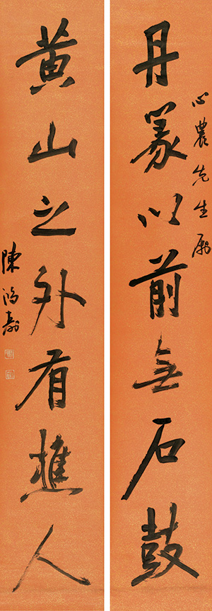 此聯寫于灑金紅箋紙上,由于這種紙的特性,可以使毛筆運行的軌跡呈現出來,這就更能想見書家揮毫時的狀態了。上聯“丹篆以前無石鼓”,寫到“無”字時,墨將用盡,而陳鴻壽依舊一往無前,使得這個“無”字得線條顯得蒼勁老辣,而且在七個字中取得了變化和節奏感。“石”字撇畫極盡縱逸之勢,顯得快意磊落。下聯“黃山之外有樵人”,同樣放筆直干,“樵人”二字不惟在結字上動感十足,天趣盎然,筆畫也蒼澀可喜。這幅作品,妙在變化無端而出于無意,正是書家學養、天性的出色展現。