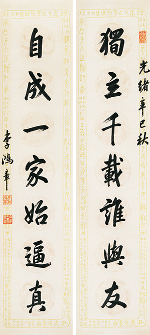 此聯(lian)為(wei)李鴻章光緒辛巳(1881)秋日(ri)所作,一如既(ji)往的(de)使用了花箋紙張書寫,保持了其慣有的(de)臺閣雍(yong)容(rong)之(zhi)氣(qi)。此時的(de)李鴻章身兼一等素義伯(bo),太子太傅,文化武(wu)英兩殿大(da)學士,統帥北洋(yang)新軍,正是(shi)意(yi)氣(qi)風發之(zhi)時。“獨(du)立千(qian)載誰與友,自(zi)(zi)稱一家始逼真。”聯(lian)中所展露(lu)出的(de)崢嶸自(zi)(zi)負之(zhi)氣(qi),將(jiang)這位(wei)東(dong)方俾斯(si)麥(mai)睥自(zi)(zi)強圖新的(de)壯(zhuang)志暴露(lu)無遺(yi)。而此時這位(wei)官居宰輔,出將(jiang)入相的(de)老人,仿佛也絲毫沒有注意(yi)到,正逐漸匯聚于他頭頂的(de)甲午陰云。