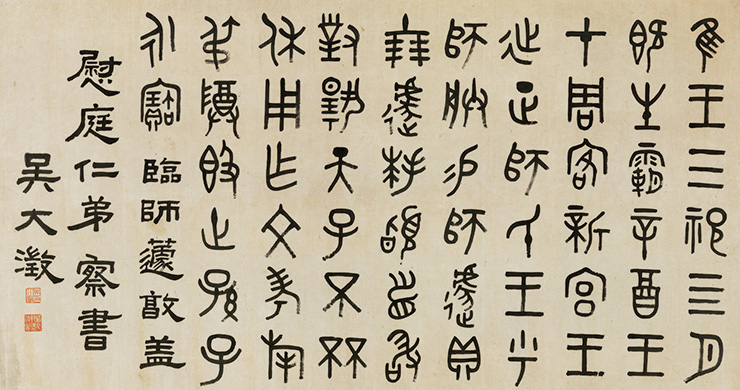 此幅臨《師蘧敦蓋銘》與“乙酉忠(zhong)臣孝子聯(lian)”相(xiang)似,都(dou)屬吳(wu)大澂(cheng)為(wei)袁世凱所作的篆(zhuan)書作品。吳(wu)大澂(cheng)一(yi)生酷愛金石,精(jing)于鑒別與古(gu)文(wen)字(zi)考釋,書法之中(zhong)又以(yi)篆(zhuan)書最著(zhu),并與古(gu)籀(zhou)文(wen)結(jie)合,淵雅(ya)樸茂,功力甚深(shen)。圖中(zhong)筆(bi)(bi)(bi)法嚴謹持重,中(zhong)鋒(feng)澀(se)進,筆(bi)(bi)(bi)畫具有很強的剛性特質。上緊下松,筆(bi)(bi)(bi)畫粗細勻稱,空間(jian)排布均(jun)勻,轉折(zhe)圓中(zhong)見(jian)方(fang),轉筆(bi)(bi)(bi)處隨(sui)性沖(chong)和,盡可從高古(gu)之中(zhong)窺其天然意趣。