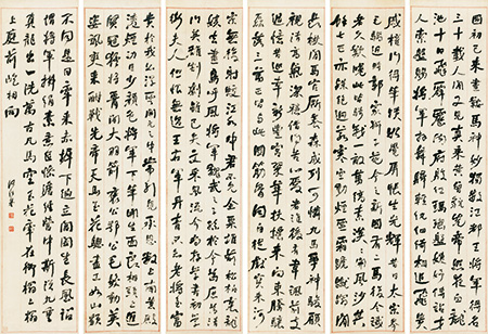 與清代許多碑派書家不同的是,何紹基既堅持其師阮元“南北書派論”與“篆分遺法”的標準,認為要達到矯正時弊的目的,應力學北派,然卻不能因此而輕視簡牘一路的帖書。他在創作實踐上不囿于派別之見,把自己的取法拓展到更廣闊的范圍之中,從而使自己的書法風格南北兼融,也注入了更多的審美內涵。他在篆隸方面的探索另當別論,僅就行草書而言,無論他給后人留下多少懸念與遺憾,事實上,他在清代碑派書家行草書中成就是最高的。從金農、伊秉綬到鄧石如,再到后來的趙之謙、張裕釗等人,一代又一代的碑派書家專注于篆隸,行草筆法漸漸生疏了,有的幾乎不解使轉,行筆拖沓,狀如爛草。何紹基的突出之處在于,南北兼收,碑帖并重,由顏行上溯篆隸,又由篆隸融會行草,其創作的途徑也是極具借鑒價值的。