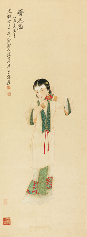 張(zhang)氏(shi)一(yi)生與(yu)(yu)梨園(yuan)名(ming)旦大(da)多往(wang)來密(mi)切。本幅作品為(wei)張(zhang)大(da)千1945年中元節后為(wei)川劇名(ming)角(jiao)陽友鶴所作,張(zhang)大(da)千自1938年由(you)北(bei)平回(hui)歸成都之后,所在(zai)居所毗鄰悅(yue)來茶園(yuan)。是(shi)時川劇名(ming)角(jiao)都周企何、陽友鶴等(deng)皆在(zai)此演出,即與(yu)(yu)常來看戲的張(zhang)大(da)千相識相會(hui)(hui),漸成莫逆(ni)。張(zhang)大(da)千為(wei)人豪爽(shuang),每(mei)逢節慶都以畫作贈(zeng)友,而川地名(ming)角(jiao)們也多會(hui)(hui)為(wei)其單獨表演作為(wei)答(da)謝。張(zhang)大(da)千曾說:而且戲中的美(mei)人最美(mei),特別(bie)是(shi)各(ge)位名(ming)角(jiao)所飾歷代(dai)美(mei)女,無(wu)論是(shi)眼神、神態(tai)、指法、身段、舉(ju)手(shou)投足間無(wu)不蘊含(han)著無(wu)限風(feng)情,可謂侍(shi)女畫最好的參(can)考。