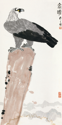 吳作(zuo)人(ren)筆下的(de)(de)(de)(de)(de)(de)鷹(ying)(ying)(ying)具(ju)有豐富的(de)(de)(de)(de)(de)(de)象征(zheng)性意(yi)味,他綜合了鷹(ying)(ying)(ying)、鷲(jiu)、雕幾種(zhong)兇(xiong)猛型禽(qin)鳥的(de)(de)(de)(de)(de)(de)特(te)點,創造出(chu)具(ju)有鮮明風(feng)格(ge)特(te)征(zheng)的(de)(de)(de)(de)(de)(de)鷹(ying)(ying)(ying)之(zhi)形象。此幅《高(gao)瞻》用筆果敢,氣韻生(sheng)動(dong),渾厚(hou)蒼(cang)勁,大氣磅(bang)礴,為吳作(zuo)人(ren)畫鷹(ying)(ying)(ying)作(zuo)品中一(yi)件精彩之(zhi)作(zuo)。畫中的(de)(de)(de)(de)(de)(de)鷹(ying)(ying)(ying)雖未振翅飛翔,亦能顯(xian)現(xian)出(chu)睥睨天下的(de)(de)(de)(de)(de)(de)王(wang)者之(zhi)氣,目(mu)似明燈,嘴如利斧,背上與翅尖的(de)(de)(de)(de)(de)(de)羽毛分別以幾塊厚(hou)重的(de)(de)(de)(de)(de)(de)的(de)(de)(de)(de)(de)(de)墨(mo)(mo)塊表(biao)現(xian)出(chu)來,再以淡墨(mo)(mo)畫鷹(ying)(ying)(ying)的(de)(de)(de)(de)(de)(de)腹部(bu)(bu)(bu)、腿(tui)(tui)部(bu)(bu)(bu)與頭部(bu)(bu)(bu)、頸部(bu)(bu)(bu),爪用重墨(mo)(mo)勾勒,在鷹(ying)(ying)(ying)的(de)(de)(de)(de)(de)(de)頭部(bu)(bu)(bu)、背部(bu)(bu)(bu)、胸部(bu)(bu)(bu)、腿(tui)(tui)部(bu)(bu)(bu)用積(ji)墨(mo)(mo)法(fa)(fa),疏(shu)密(mi)有致地點上重墨(mo)(mo)點,以增加鷹(ying)(ying)(ying)的(de)(de)(de)(de)(de)(de)力(li)(li)度。不僅把雄鷹(ying)(ying)(ying)不羈的(de)(de)(de)(de)(de)(de)姿態表(biao)現(xian)得(de)淋漓(li)盡致,更令簡單(dan)的(de)(de)(de)(de)(de)(de)題款書法(fa)(fa)中蘊(yun)含了無窮(qiong)的(de)(de)(de)(de)(de)(de)力(li)(li)量。