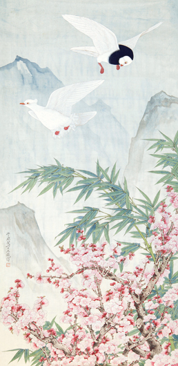 此幅構圖(tu)豐富(fu)(fu),坡石、修竹(zhu)、杏(xing)花、白鴿(ge),章(zhang)法疏密有致,主次分(fen)明,絲毫不見(jian)雜(za)亂和(he)堆砌痕跡,整個畫面(mian)呈現出富(fu)(fu)貴吉祥(xiang)的(de)典雅氣派。畫中(zhong)的(de)修竹(zhu)茂盛,竹(zhu)葉與杏(xing)花相伴相生,互(hu)為(wei)映襯,明亮鮮(xian)艷的(de)粉色與綠色的(de)修竹(zhu)形成鮮(xian)明的(de)對(dui)比(bi)。花葉用(yong)筆勁健,設色亦(yi)明快華(hua)美(mei),富(fu)(fu)于裝(zhuang)飾性。兩(liang)只白鴿(ge)呼(hu)應顧盼,令人(ren)體會到在(zai)一(yi)個祥(xiang)和(he)的(de)春日花園中(zhong)野趣(qu)活(huo)潑的(de)情景(jing)。禽鳥的(de)造型(xing)逼真生動,鳥之喙爪(zhua)及根(gen)(gen)根(gen)(gen)羽毛(mao)均描寫得無微不至,筆法細(xi)致精(jing)謹,生動活(huo)潑的(de)景(jing)象仿佛(fo)宣示著春天(tian)的(de)來(lai)臨(lin)。