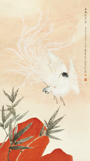 張(zhang)善孖筆(bi)下的白鳳(feng)題材主(zhu)要見于(yu)上世紀(ji)30年(nian)代中(zhong)期,畫面構成(cheng)皆由“丹山、白鳳(feng)、墨竹(zhu)”三物為(wei)主(zhu)體(ti),背景(jing)或以(yi)金箔為(wei)底或者紙本渲以(yi)朱(zhu)紅,光華霞靄,凸顯仙塵。畫中(zhong)鳳(feng)凰(huang)通身(shen)潔白,身(shen)上翎毛以(yi)細線勾(gou)勒(le),敷以(yi)鈦白,只在尾羽處用(yong)花青和(he)濃(nong)墨渲染,筆(bi)鋒略有(you)頓挫,墨與(yu)色配合得(de)天衣無縫。潔白濃(nong)密的翎毛渾然一體(ti)卻又根根分明,尤其是舞動的尾羽在空(kong)中(zhong)劃出數條優美的弧線,充滿(man)活力(li)。縱(zong)觀全(quan)畫吉祥華美,筆(bi)工精(jing)良,可謂張(zhang)善孖先生不可多得(de)作畫精(jing)品(pin)。