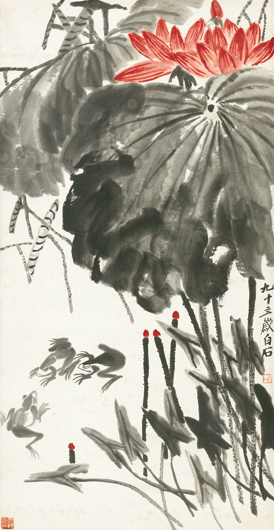 “衰年(nian)變(bian)法(fa)(fa)”與“紅花墨葉(xie)”可謂(wei)是(shi)白(bai)石老人藝術生涯(ya)的(de)(de)(de)兩(liang)大“關鍵詞”。此幅(fu)《荷塘野(ye)趣》為白(bai)石老人“九十四”高(gao)齡所作(zuo)(zuo),用筆飽滿厚重,墨濃色(se)(se)艷,強烈而醒目,正是(shi)其衰年(nian)變(bian)法(fa)(fa)后自創”紅花墨葉(xie)”大寫意繪畫的(de)(de)(de)代表(biao)作(zuo)(zuo)品。圖中墨葉(xie)以(yi)大筆揮寫,酣暢淋漓;紅荷花團錦簇,潑辣厚重;荷蔭下的(de)(de)(de)三只青蛙嬉(xi)戲(xi)玩耍,動感鮮活。整幅(fu)作(zuo)(zuo)品的(de)(de)(de)構圖與造型,都取圓(yuan)勢(shi)而不取方勢(shi),筆墨縱放而能收斂,色(se)(se)墨對比強烈,但不忽視精致處的(de)(de)(de)刻劃(hua),更(geng)兼(jian)尺幅(fu)之大,誠謂(wei)白(bai)石老人不可多(duo)得的(de)(de)(de)晚年(nian)巨制。