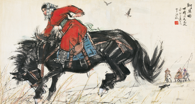 此幅《馴(xun)馬(ma)圖》作于1975年,黃(huang)(huang)胄轉業到輕工(gong)業部工(gong)藝美術總公司,這(zhe)讓他能再次拿起(qi)畫筆,傾瀉出“文革”中郁積了多年的(de)(de)(de)畫畫欲(yu)望,七十(shi)年代(dai)黃(huang)(huang)胄的(de)(de)(de)人(ren)物畫已經達到爐火(huo)純青的(de)(de)(de)地步。整幅畫面以一(yi)(yi)位策馬(ma)奔(ben)騰的(de)(de)(de)紅(hong)衣女(nv)子為主題,她一(yi)(yi)手(shou)攬著韁繩,上(shang)(shang)身向前傾側,幾乎要(yao)在馬(ma)背上(shang)(shang)站了起(qi)來。而這(zhe)匹(pi)馬(ma)顯(xian)(xian)然還未被馴(xun)化,它在低著頭嘶鳴,前腿刨地,后(hou)腿跳(tiao)起(qi),一(yi)(yi)看便知是一(yi)(yi)匹(pi)烈性的(de)(de)(de)駿(jun)馬(ma)。在馬(ma)背上(shang)(shang)的(de)(de)(de)少(shao)女(nv)也因此顯(xian)(xian)得英姿(zi)颯爽,充滿自信與激情。畫面背后(hou)的(de)(de)(de)天空有兩只相(xiang)對(dui)翱翔的(de)(de)(de)雄鷹(ying),遠處是幾個套(tao)馬(ma)的(de)(de)(de)人(ren)影,呼(hu)應(ying)著主題,彰顯(xian)(xian)了大草原的(de)(de)(de)遼闊和豐茂。